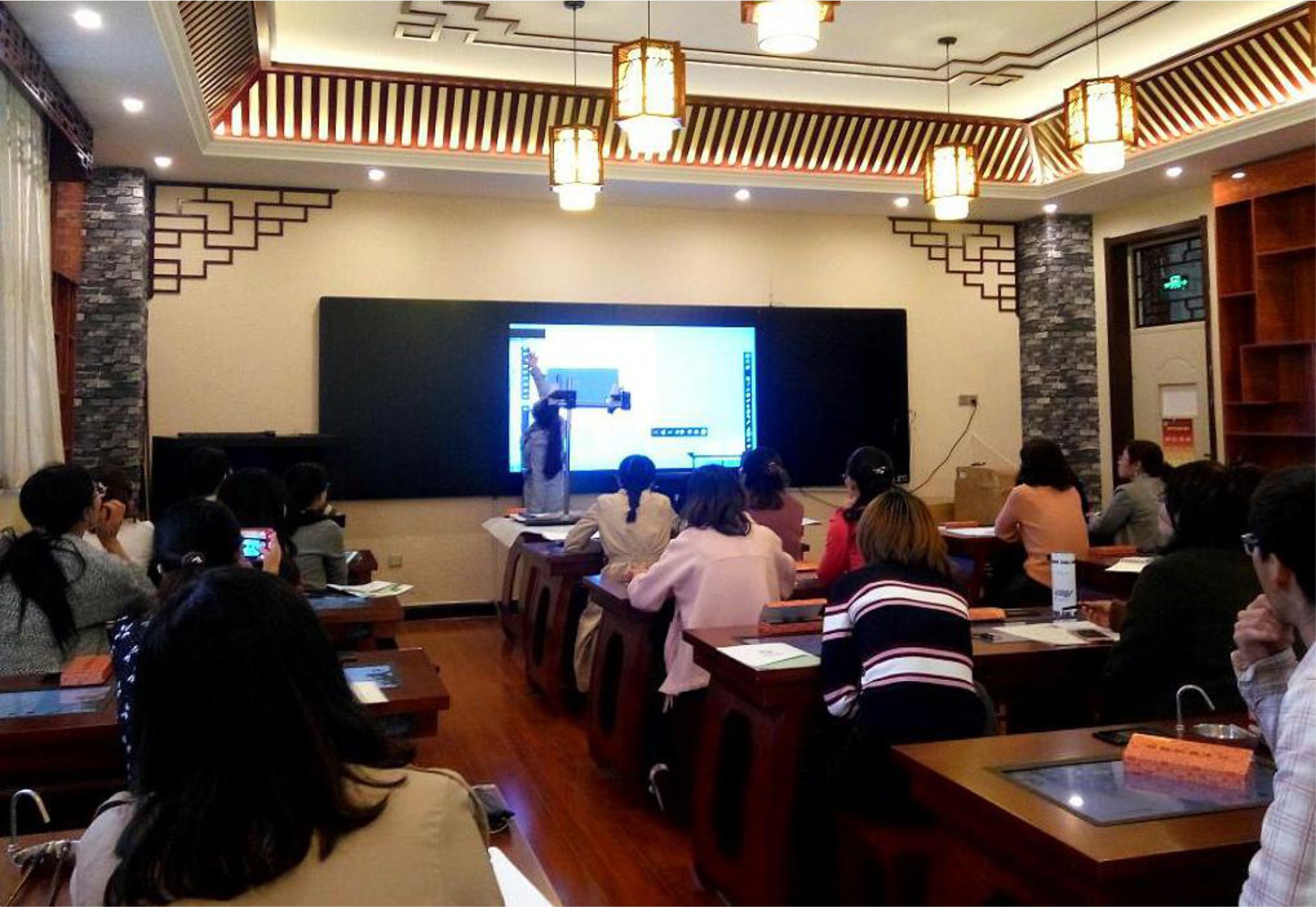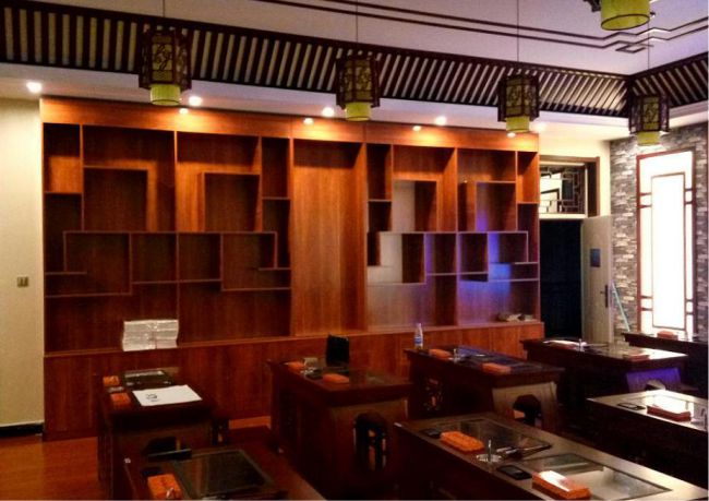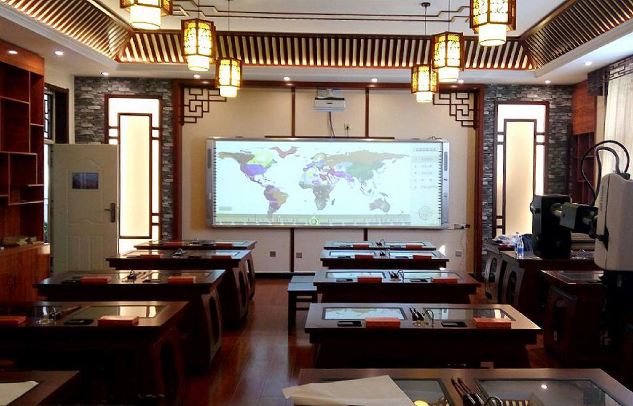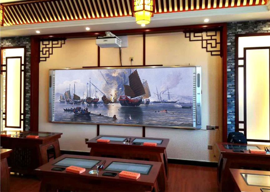 从走进教室,博物架、仿古壁纸、古色古香的方格镂空花雕随处可见,文房四宝静置于木质长桌上,长桌玻璃镜面内置全息书法字库、书法课件播放系统、字帖生成系统等,学生可以直接将宣纸铺在桌上临摹,即可练习书法。环顾周围,你会看到各个时期的器物,如周朝的青铜方鼎、春秋时期的战车、明清的仿瓷以及很多国学大师的经典语录,整间教室都充满着静谧,流淌着淡淡墨香。