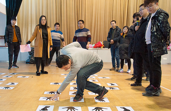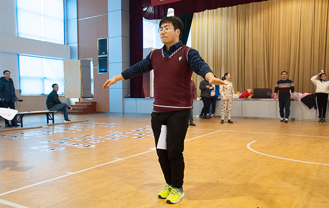 ▲勇往直前:按照地面摆放的手脚图,跳房子一样在30秒内到达终点。手脚不对应淘汰!跌落地面淘汰!超过时间淘汰!这一关一下子淘汰了不少人。