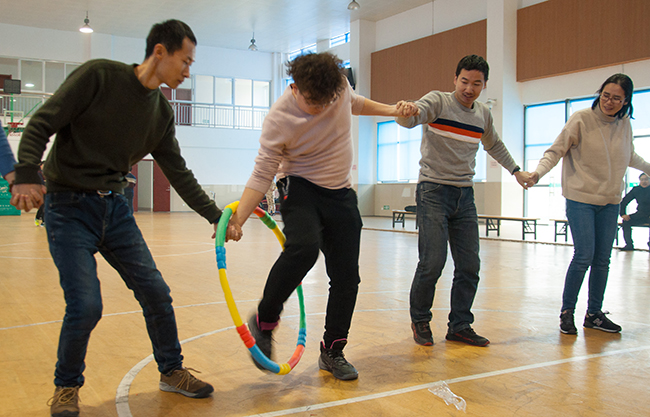 ▲连环套:手牵手从呼啦圈中穿过,用时最少的一组获得最终胜利。呼啦圈:你们这届,是我带过最差的一届。。。