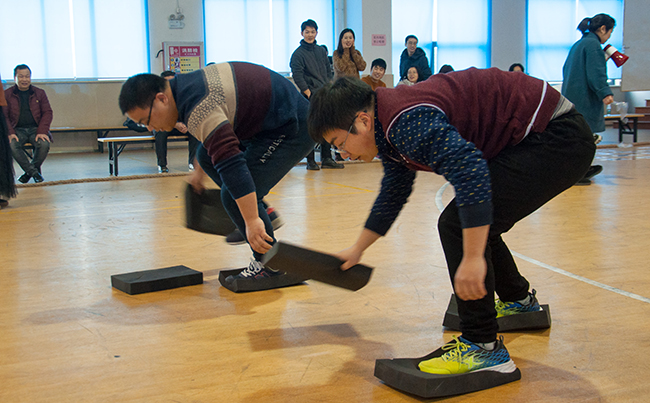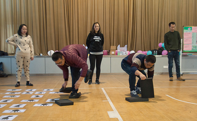 ▲移形换步:每人三块海绵垫,参赛者必须在海绵垫上行走,手脚着地者淘汰,用时最长的三人淘汰