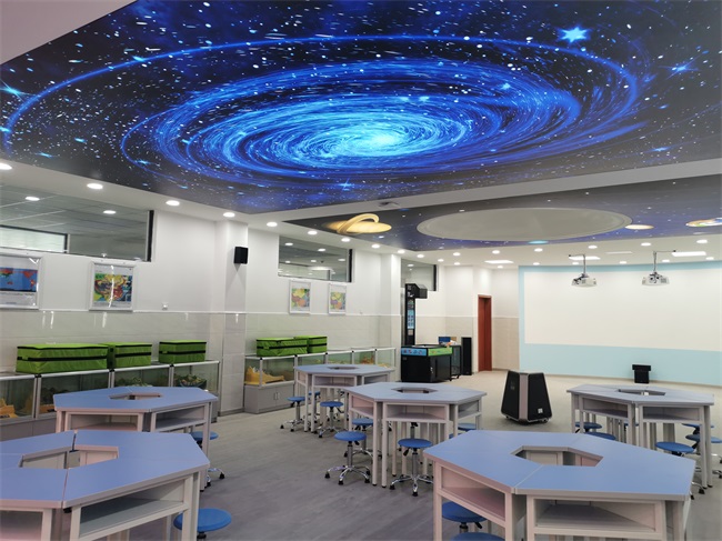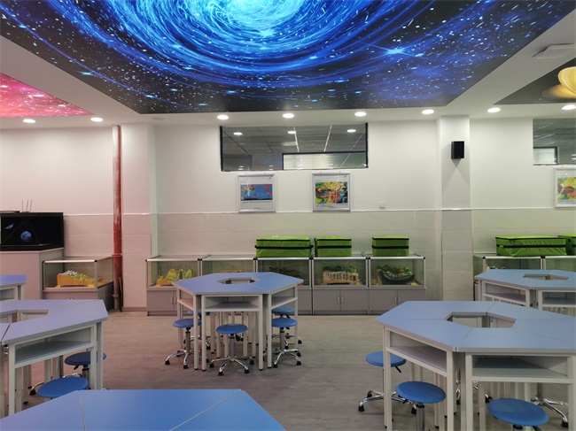 深邃的蓝色、小组学习式的课桌椅以及四周的地理知识窗帘和地形地貌模型,羿飞地理专用教室一改传统教室的设计布局,以更清新自由的形象展现在师生面前。