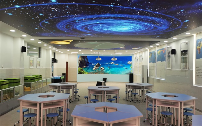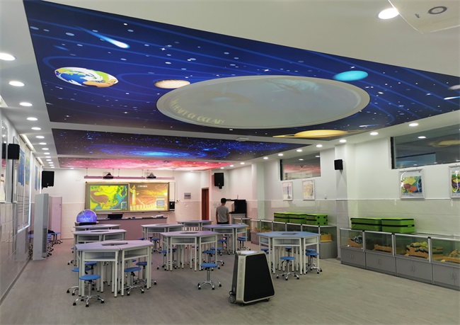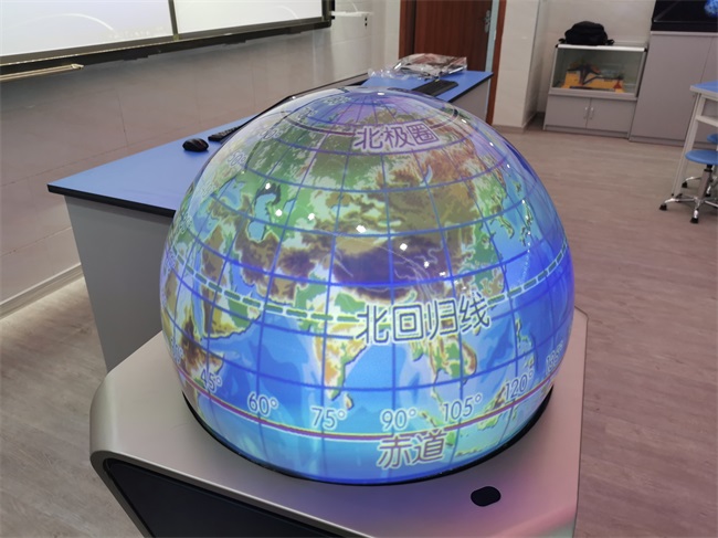 羿飞这间数字化地理专用教室配备了多媒体超半球互动球幕投影演示仪、数字立体地形、天文演示仪、环幕示教系统、AR地理沙盘、数字模型等教学设备联动,为地理教学提供了一种更便利、更高效的方式。