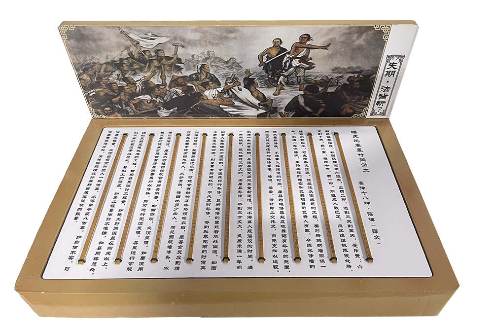 我司产品秦律竹简演示套装选取睡虎地秦墓竹简中《秦律·徭律》一章,严格按照秦简规格与体例进行编撰镌刻,务求保有其历史沧桑韵味。演示套装通过新中国时期出土史料,对两千年来奉为圭臬的《史记·陈涉世家》中“失期,法皆斩”的秦末大起义原因提出质询,打破对秦代律法森严残酷的固有印象,以期能够激发学生独立思考能力,并培育出“不唯上、不唯书、只唯实”的历史探究精神。