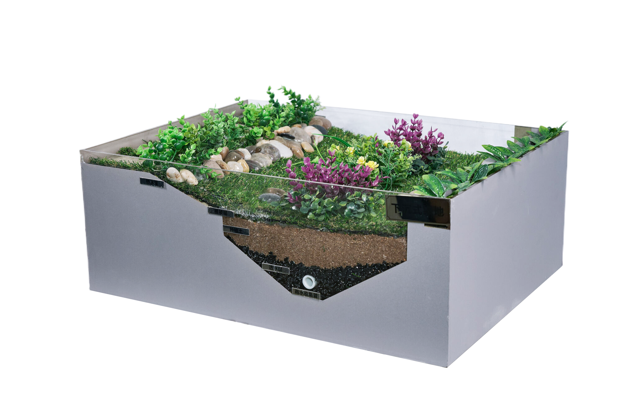 下沉式绿地模型是一种创新的生态设计,旨在通过模拟自然生态系统,提升城市绿地的生态功能与教育价值。该模型将绿地设计为低于周围地面的凹陷区域,利用地形优势收集和滞留雨水,促进自然渗透与净化,减少地表径流,缓解城市内涝问题。同时,下沉式绿地通过种植多样化的本土植物,营造接近自然的生态环境,吸引鸟类、昆虫等生物,增强生物多样性。