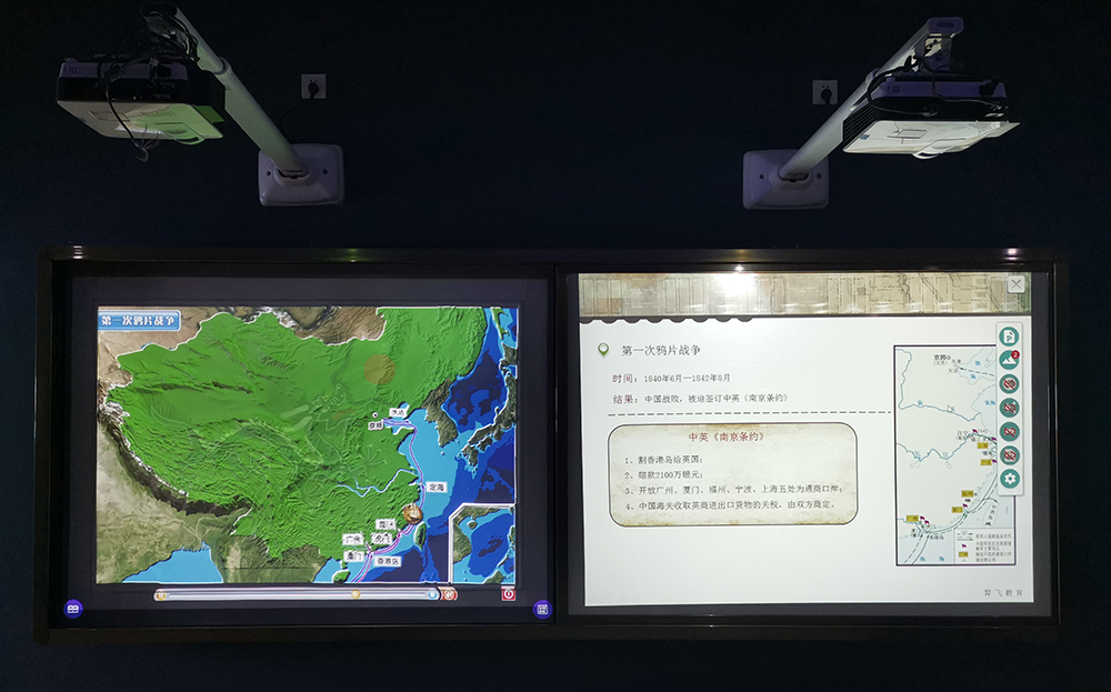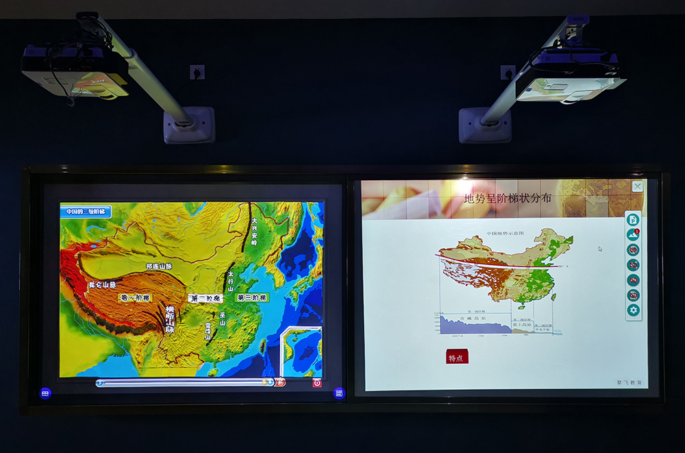 数字立体地形由立体模型(中国/世界)、推拉白板、投影机、互动模块、应用软件及演示内容构成。教师通过手中的控制笔指点击模型或演示白板上的功能按钮,即可演示中国地形、河流,降水量、植被、温度带、气候等的文字、图片、视频、动画等地理信息,数字立体地形全方位地将模型的课件内容展示给学生,最大的赋予了模型更丰富的教学内容,更好地诠释数字化多媒体地理教学理念,使在地理教学应用上更加生动,形象。